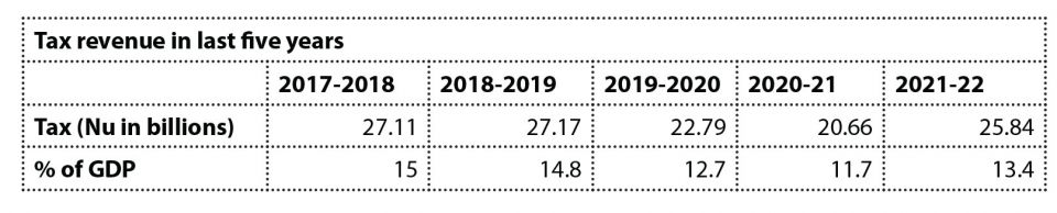In the fiscal year 2021-22, tax revenue witnessed a 25 percent increase to Nu 25.84 billion compared to the previous year, contributing to 13.4 percent of GDP. This represented a 1.7 percentage point increase.
