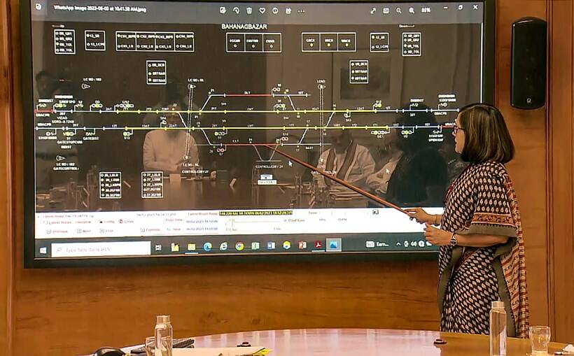 An official gives a demonstration about the Odisha train accident as Prime Minister Narendra Modi chairs a meeting to take the stock of situation after the mishap, in New Delhi, Saturday, June 3, 2023. (PTI Photo) 11/12