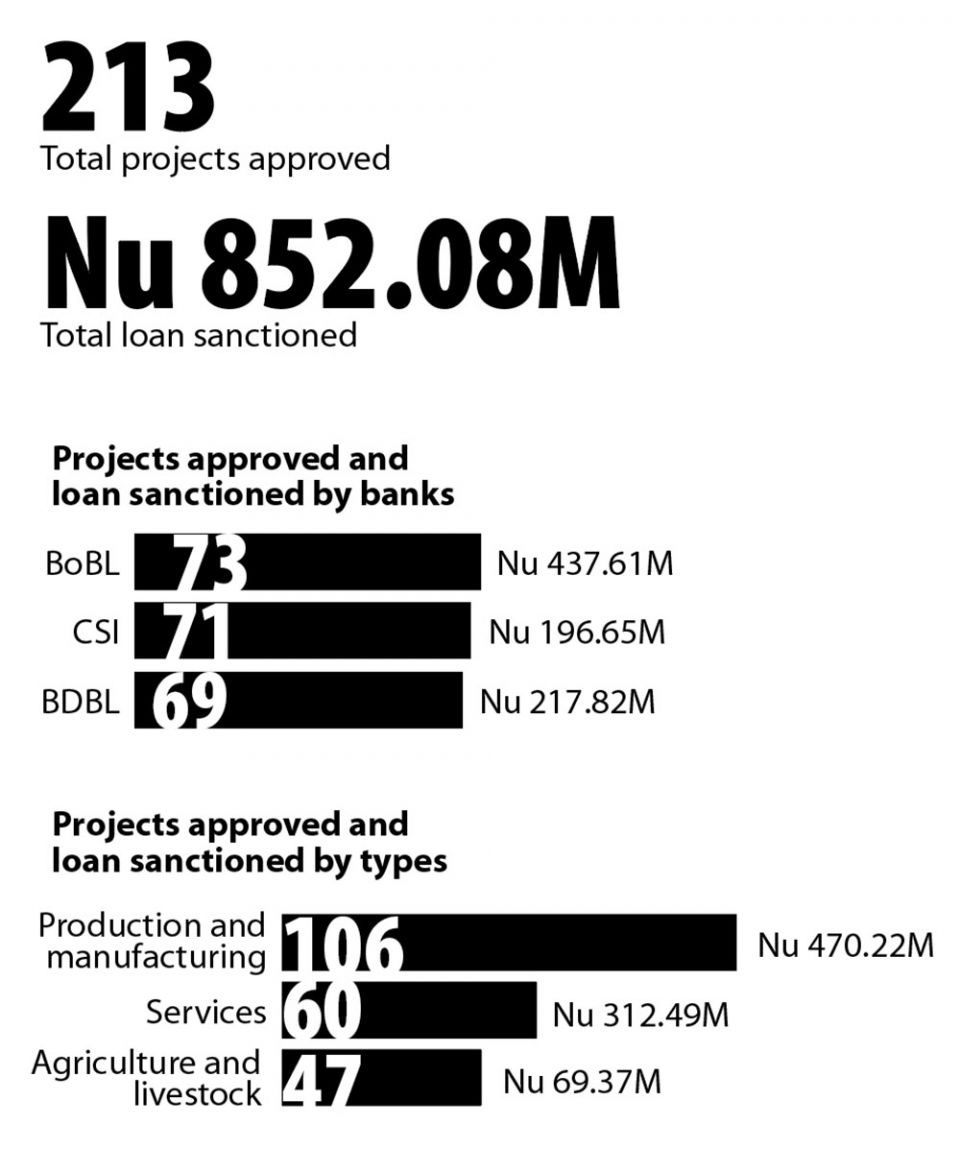 The production and manufacturing sector saw the highest number of approved projects at 106 with a total loan amount sanctioned Nu 470.22M, followed by 60 in services with a total loan amount sanctioned Nu 312.49M and 47 projects in agriculture and livestock sectors with a total amount Nu 69.37M spreading across 18 Dzongkhags.