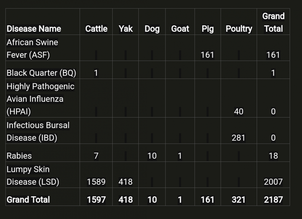 Lumpy skin disease also killed 418 yaks. Rabies killed 10 dogs and one goat. A total of 161 pigs died of African swine fever, and 321 poultry died from infectious bursal disease and highly pathogenic avian influenza (HPAI).