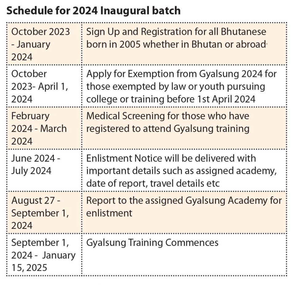As per the Gyalsung Act, —it is mandatory for all eligible Bhutanese whether living in Bhutan or abroad. However, a person enrolled in monastic schools, a person who is deemed medically unfit by the Medical Board, and as a one-time measure for the 2024 intake, a person who is pursuing college education or vocational training after completing class 12 in 2023 may be exempted. However, the person shall be required to sign up and register before seeking an exemption.